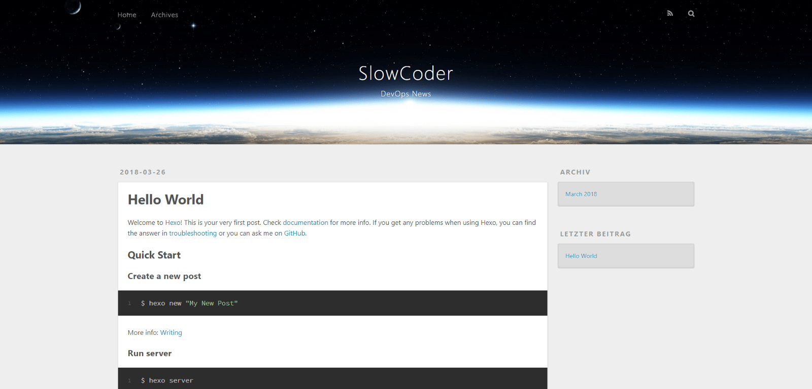 Start a local server with "hexo server". By default, this is at http://localhost:4000. You'll see Hexo's pre-defined "Hello World" test post: